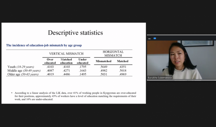 26 июля 2022 года д-р Бурулча Сулайманова, научный сотрудник Академии ОБСЕ, выступила с открытой лекцией на тему «Влияние несоответствия работы и образования…
